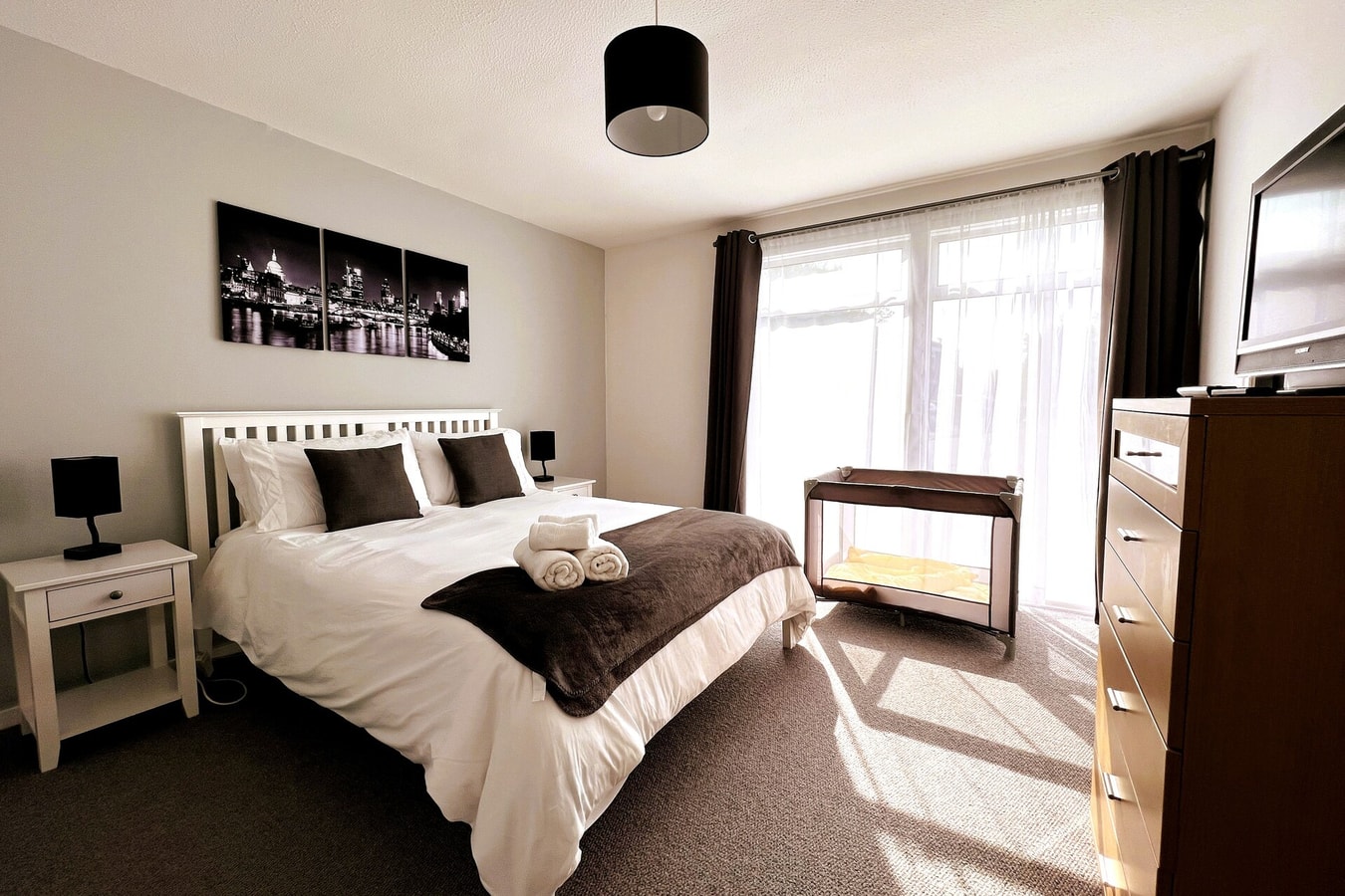 Spacious & Family friendly 2 bedroom bungalow with large garden. Lots of natural light. Open plan lounge with double sofa bed, 55" large TV & fully fitted kitchen with appliances and essentials. Finished to a very high and stylish standard. Comfortable bedrooms (king, double, single size beds and double sofa bed) & fully fitted guest bathrooms with WC and a separate toilet. Close to the town centre and train station with direct high-speed links to London.
