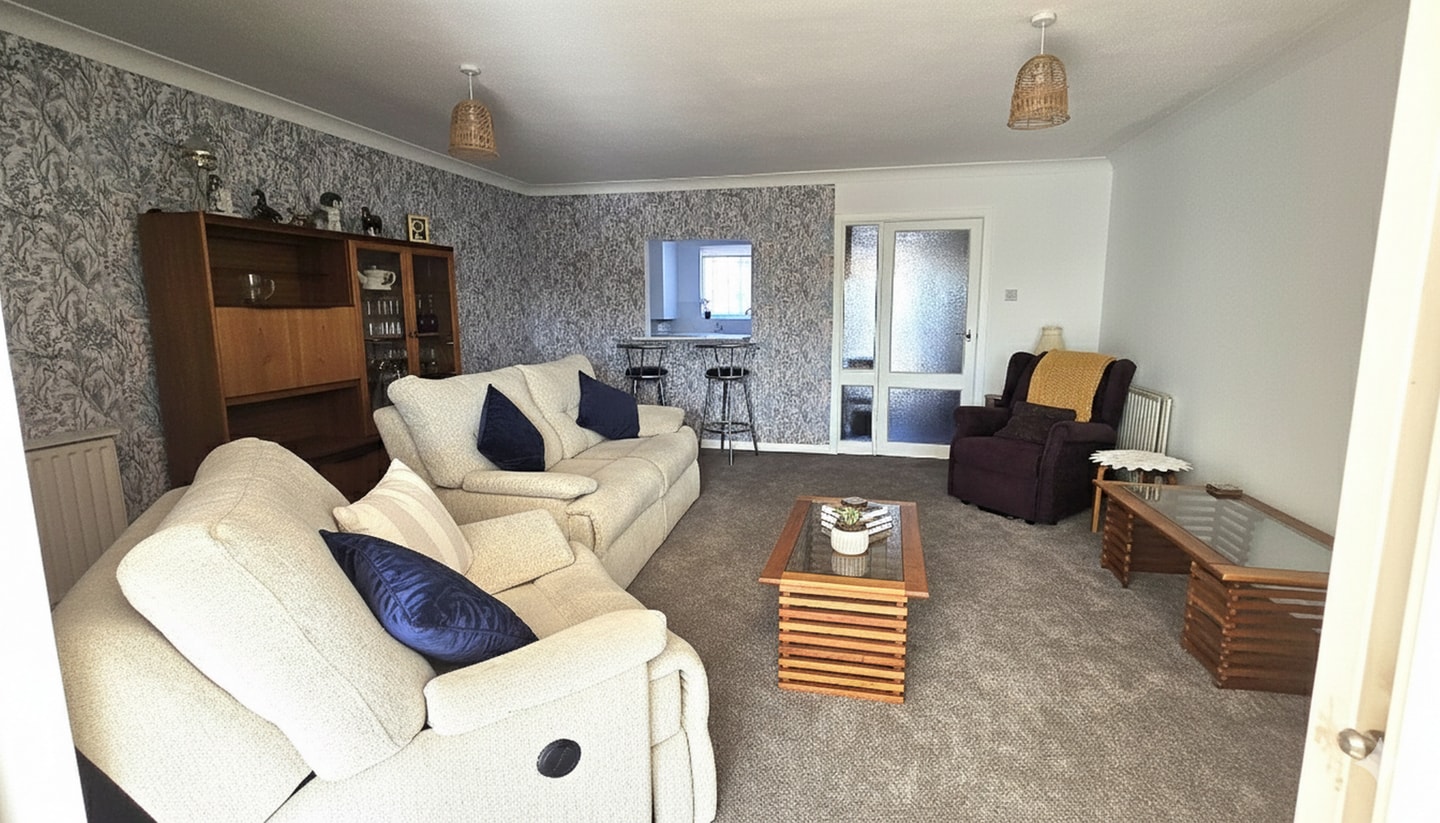 Large living area that will seat five comfortably, with 3-seater sofa and two armchairs (two riser/recliners). Freeview TV including Netflix with Wi-Fi internet access, and stereo CD player. Patio doors look out into the conservatory and the garden beyond.