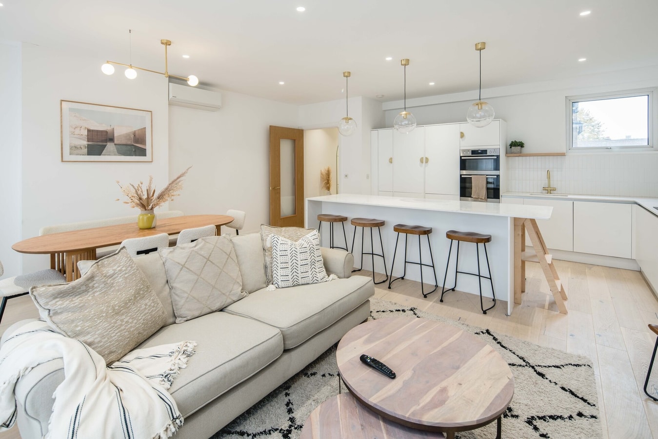 The spacious open plan living room is a delightful retreat, featuring a smart TV, ample seating on plush sofas and large windows that fill the room with natural light.