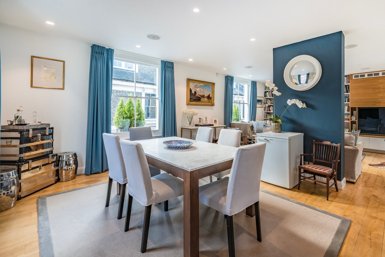 Modern fully fitted kitchen provides guests with miele dishwasher, microwave, washing machine, fridge and oven. Leading to a spacious dining area with mahogany base dining room table with marble top.