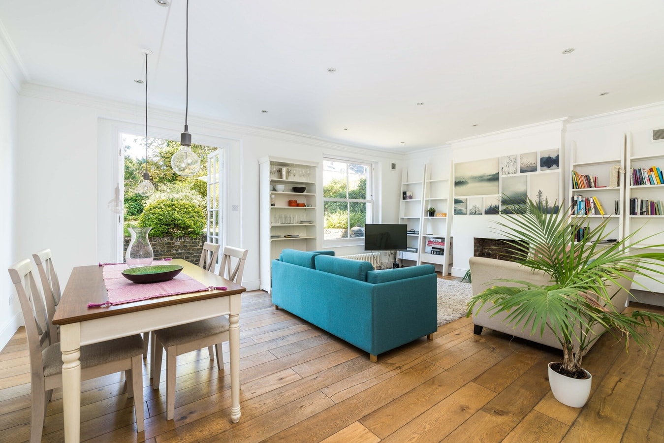 Spacious lounge with sofa bed leading to a garden with seating