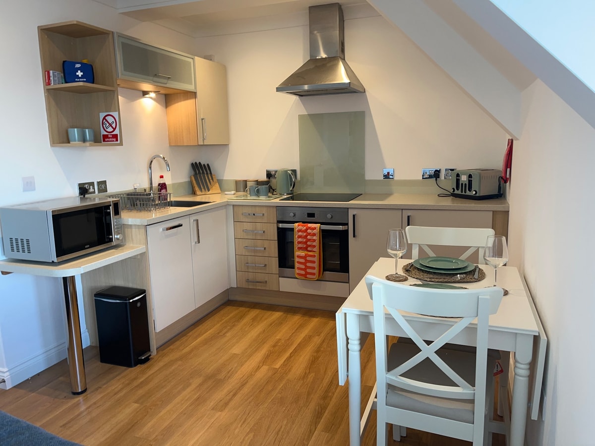 A well-presented 1 bedroom apartment with a large bay window providing lots of natural light which overlooks the beach. The apartment has an open plan living room with a large and comfortable sofa, TV, DVD player and free fast WIFI. There are also a selection of DVD’s, Books and games to enjoy.