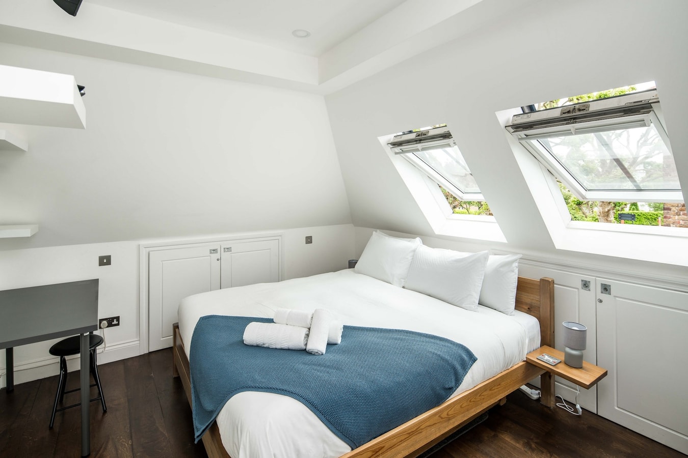 The bedroom (super king size bed) and the bathroom (shower cabin and toilet) together features plenty space to store your belongings and to wind out