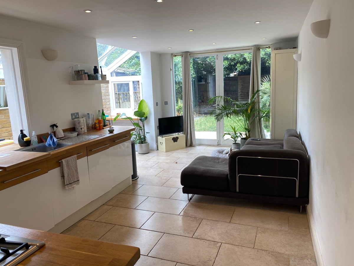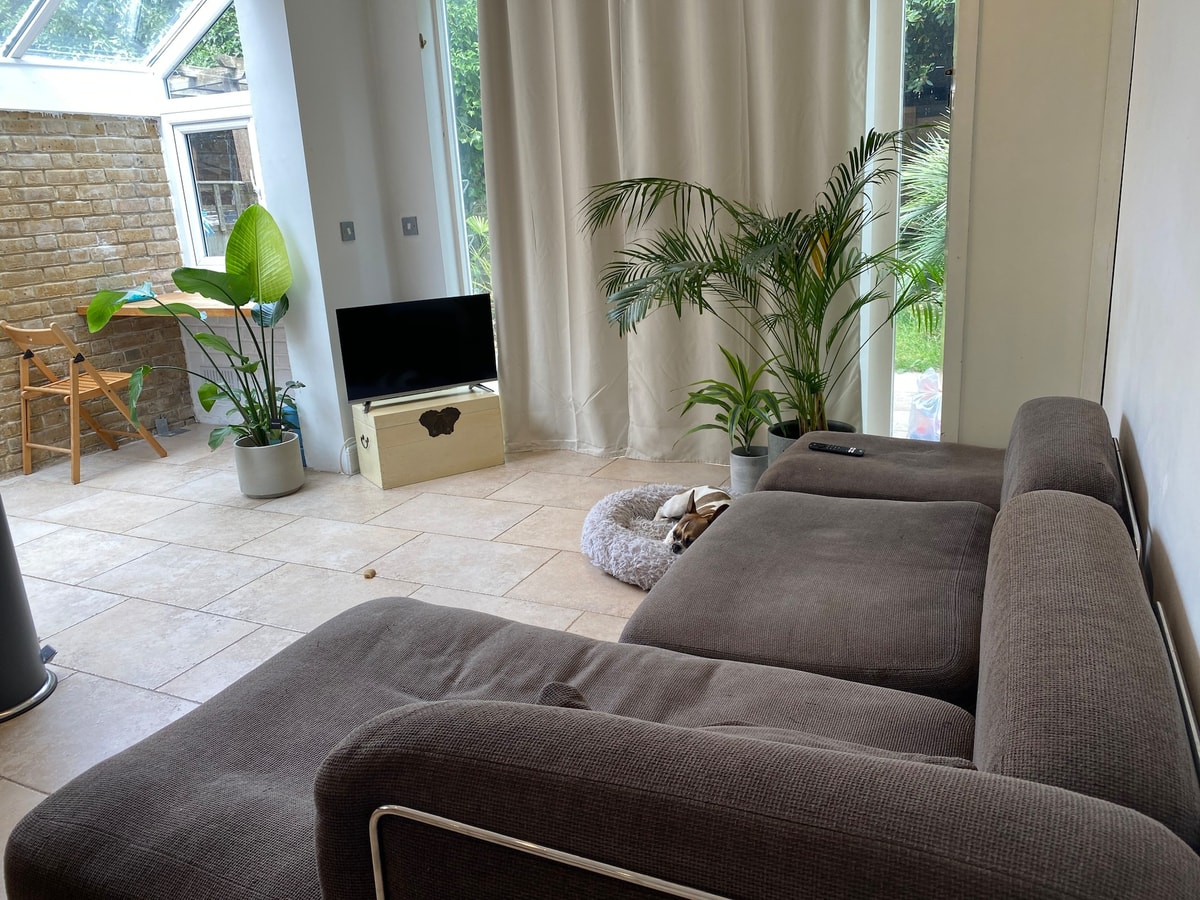 A cozy, open-plan living area with large windows and plenty of natural light. leading to a bright and narrow conservatory with a slanted glass roof perfect for relaxing.