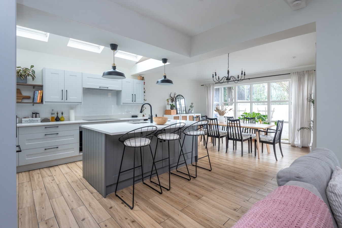 - Modern kitchen with sensor-controlled tap and manual skylights