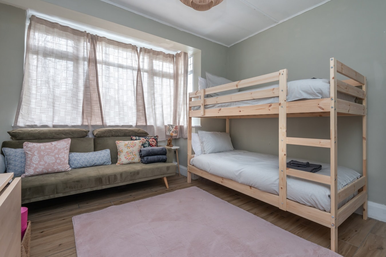 Modern 3-bedroom, 2-bathroom home in Eltham, ideal for families or travelers. Features include a well-equipped kitchen, open-plan living area, smart TVs with Netflix/Prime, and a sunny back garden. Bedrooms include a king, double, and bunk beds. Easy transport to Central London (40 mins) and direct access to Heathrow via Elizabeth Line. Quiet street, perfect for relaxing after city adventures. A cozy, stylish base for your London stay!
