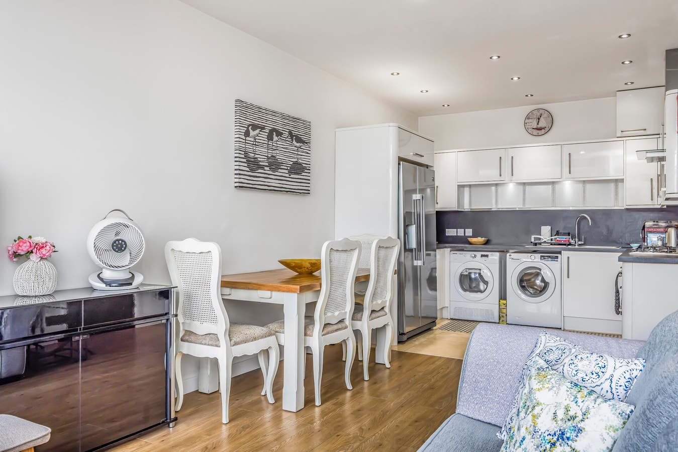 A few steps further lead you to the inviting living room with beautiful views of Portsmouth, complete with a comfortable sofa, an armchair, and a Smart TV (please log in with your own accounts). A small desk by the window offers an ideal workspace for remote workers. The adjacent dining area comfortably seats four, ideal for sharing meals with friends or family. The fully-equipped kitchen includes a kettle, toaster, microwave, oven, fridge, gas hob, and washer dryer, ensuring all your culinary needs are met.