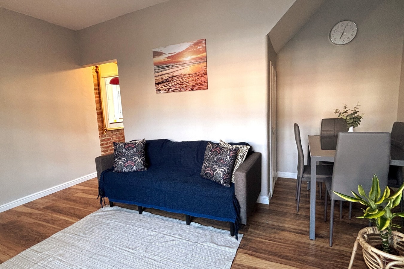 Comfortable 2-bed home in Bromley with spacious private garden. Features a king-size and small double bed, modern shared bathroom, bright living area with 50" Smart TV, dining space, and a fully equipped kitchen. Ideal for families, couples, or professionals. Sleeps 4 over 2 floors with stairs to the first floor.