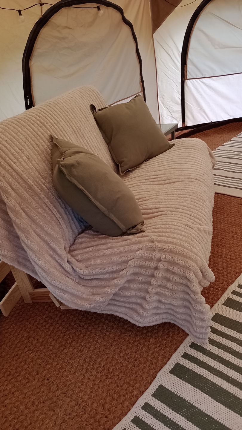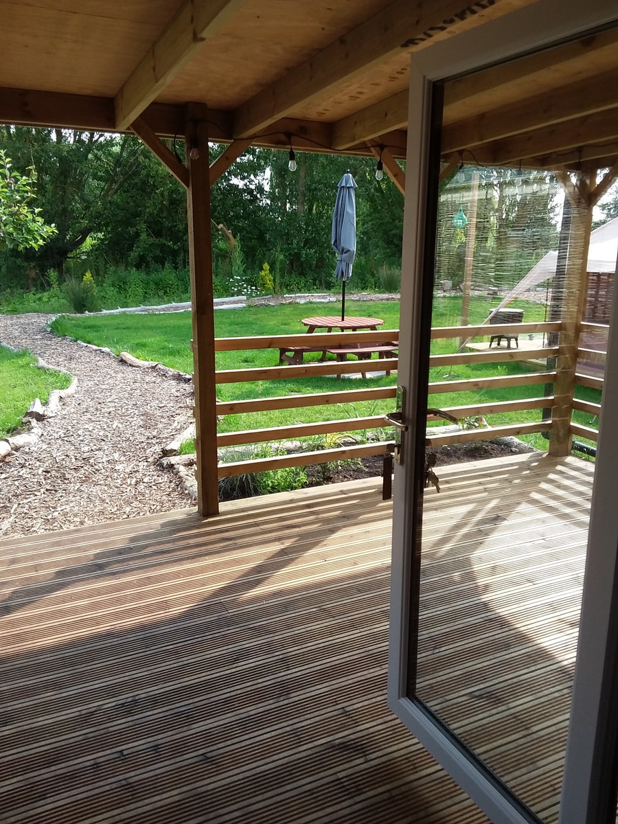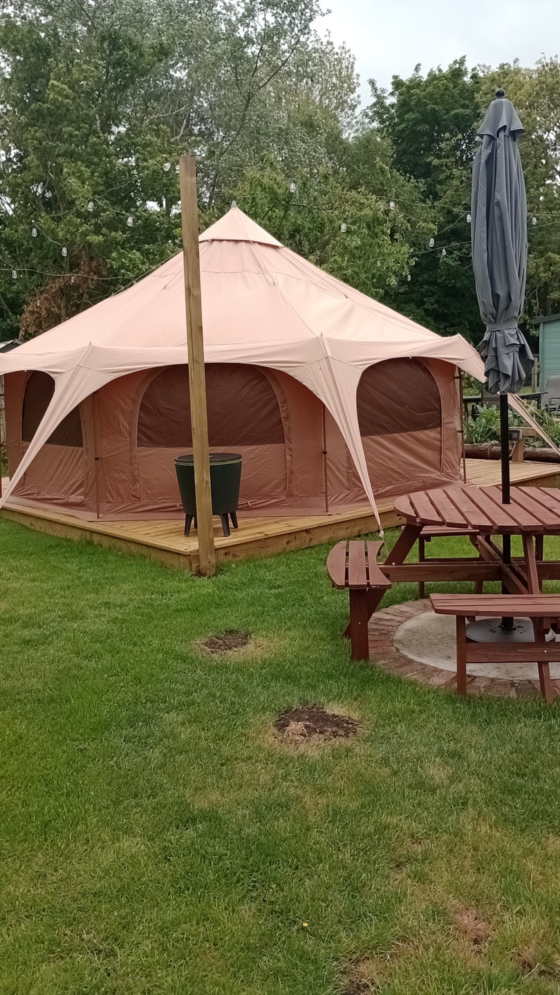 If you fancy the idea of outdoor life with all the mod cons a few steps away then Kingfisher has you in mind, 6 person bell tent for up to 4 adults and 2 children, with a double bed and exclusive use of a day room with walk in shower, wide screen tv, food preperation area with microwave and kettle, Gas BBQ outdoors and a 6 seater hot tub! All within 40 metres of our beautiful fishing lake!