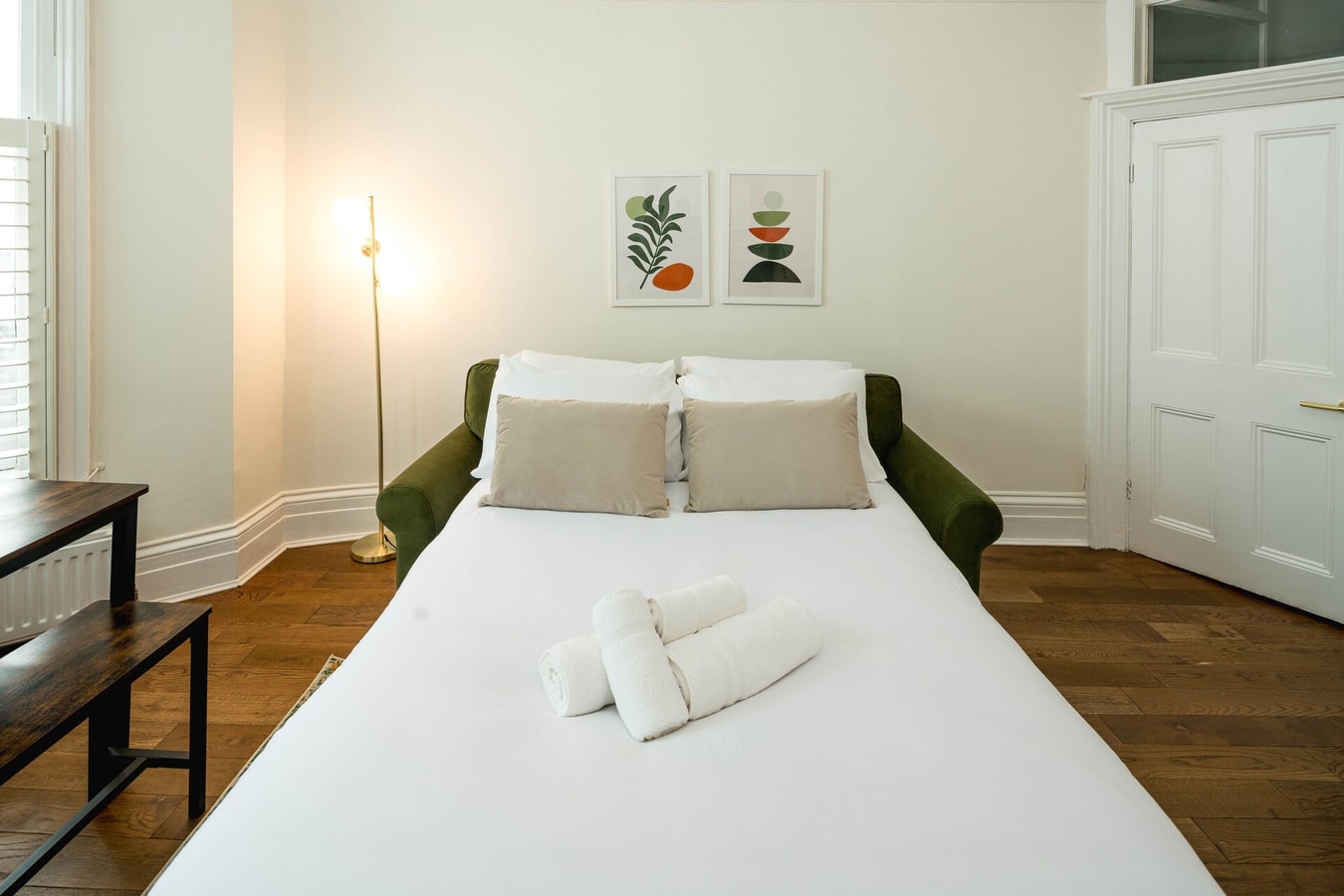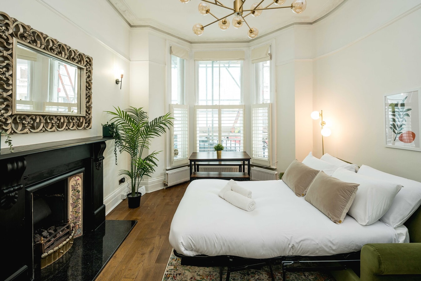 Stylish Victorian studio in the heart of Kensington with 3 m ceilings, elegant décor, and modern comforts. Features a double sofa bed, full kitchen, Smart TV, and sleek bathroom. Moments from Queen’s Tennis Club, Kensington High Street, and Barons Court Station. Perfect blend of heritage charm and city convenience for a relaxing London stay.