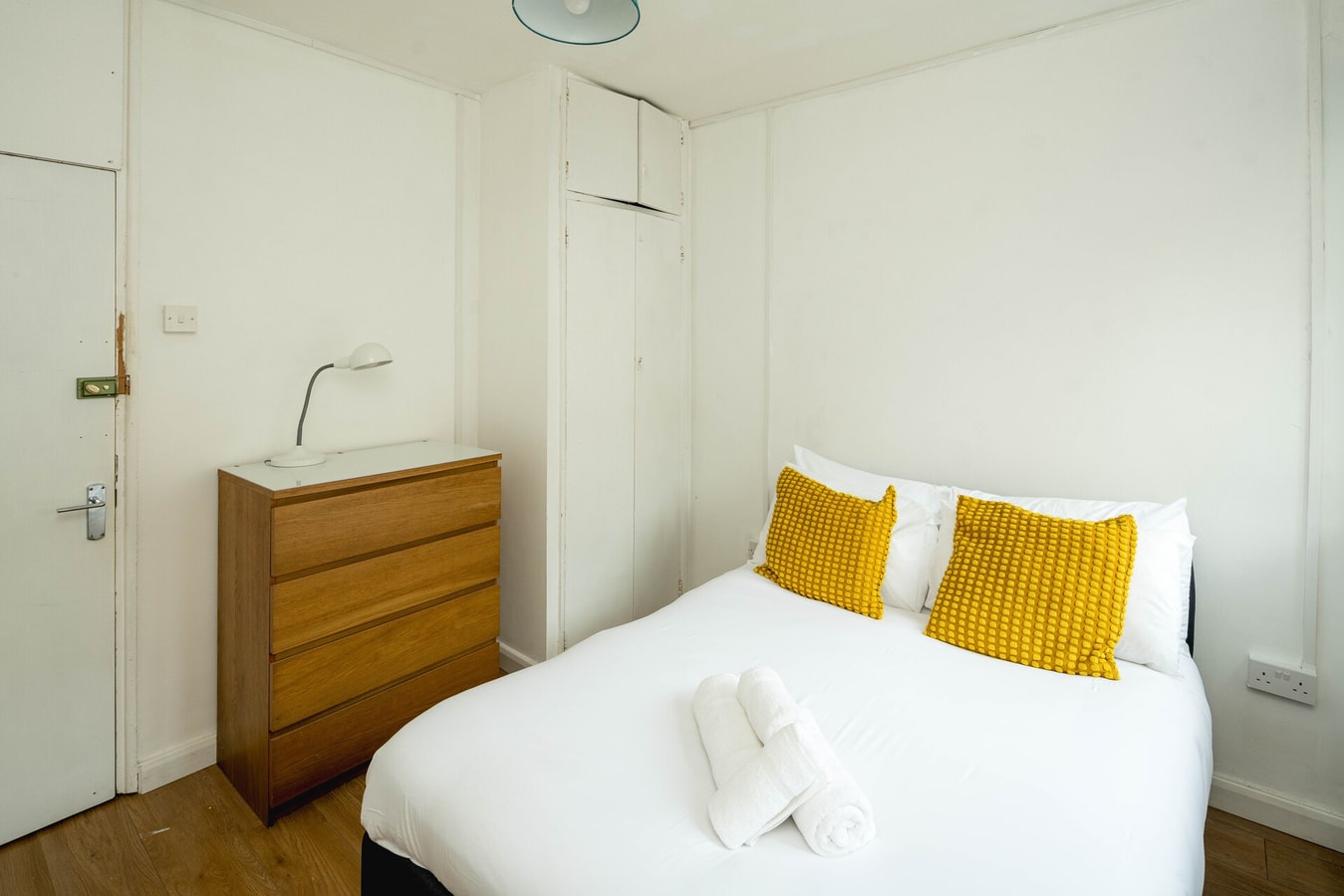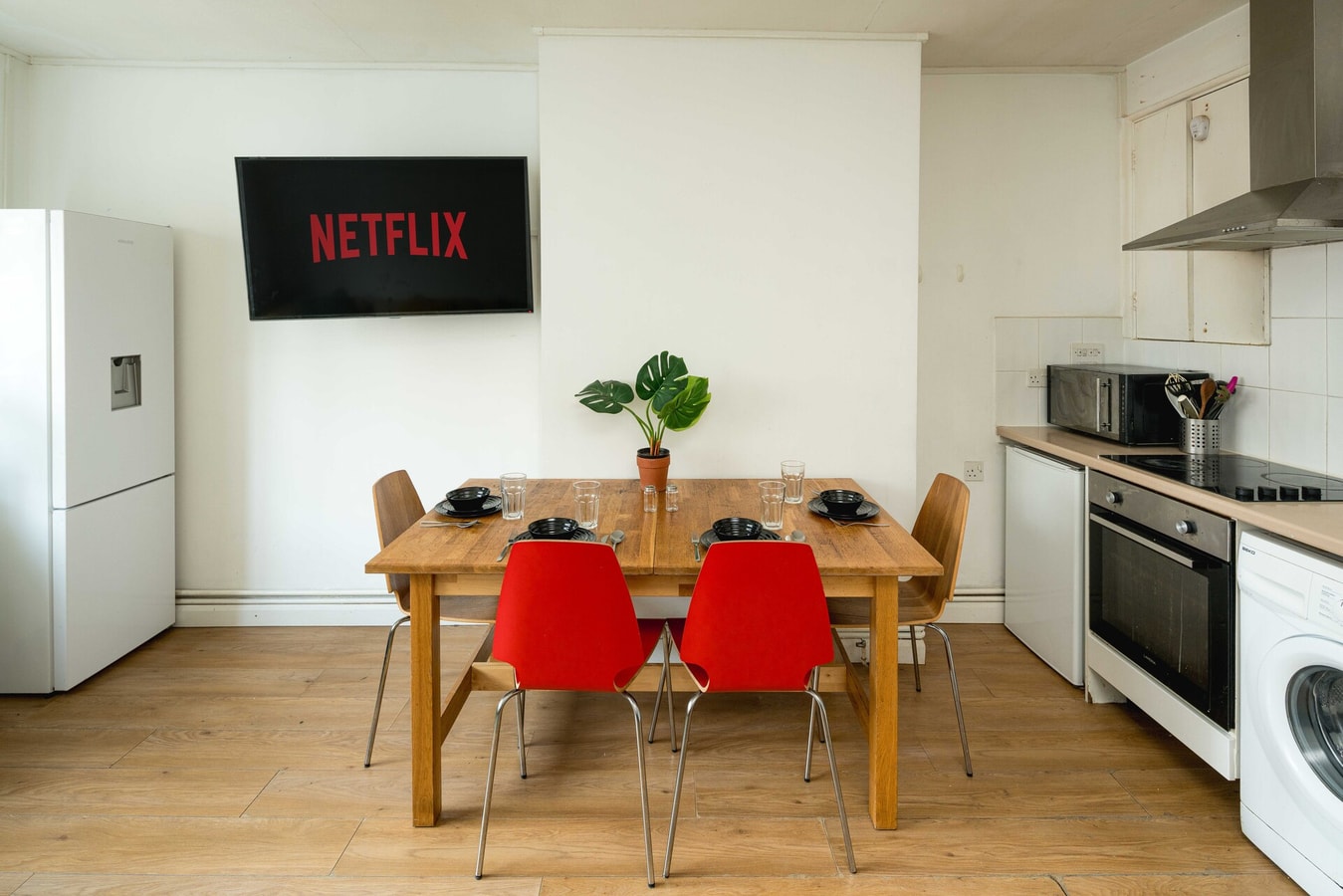 This spacious four-bedroom maisonette features four double bedrooms, a study, a large open-plan lounge with TV, and an extendable dining table ideal for group meals. The fully equipped kitchen includes two fridges, and there are two shower rooms, each with a WC. Located close to Queen Mary University, Stepney Green and Whitechapel stations, the home is also near a large park and the city farm with its Saturday farmers’ market.