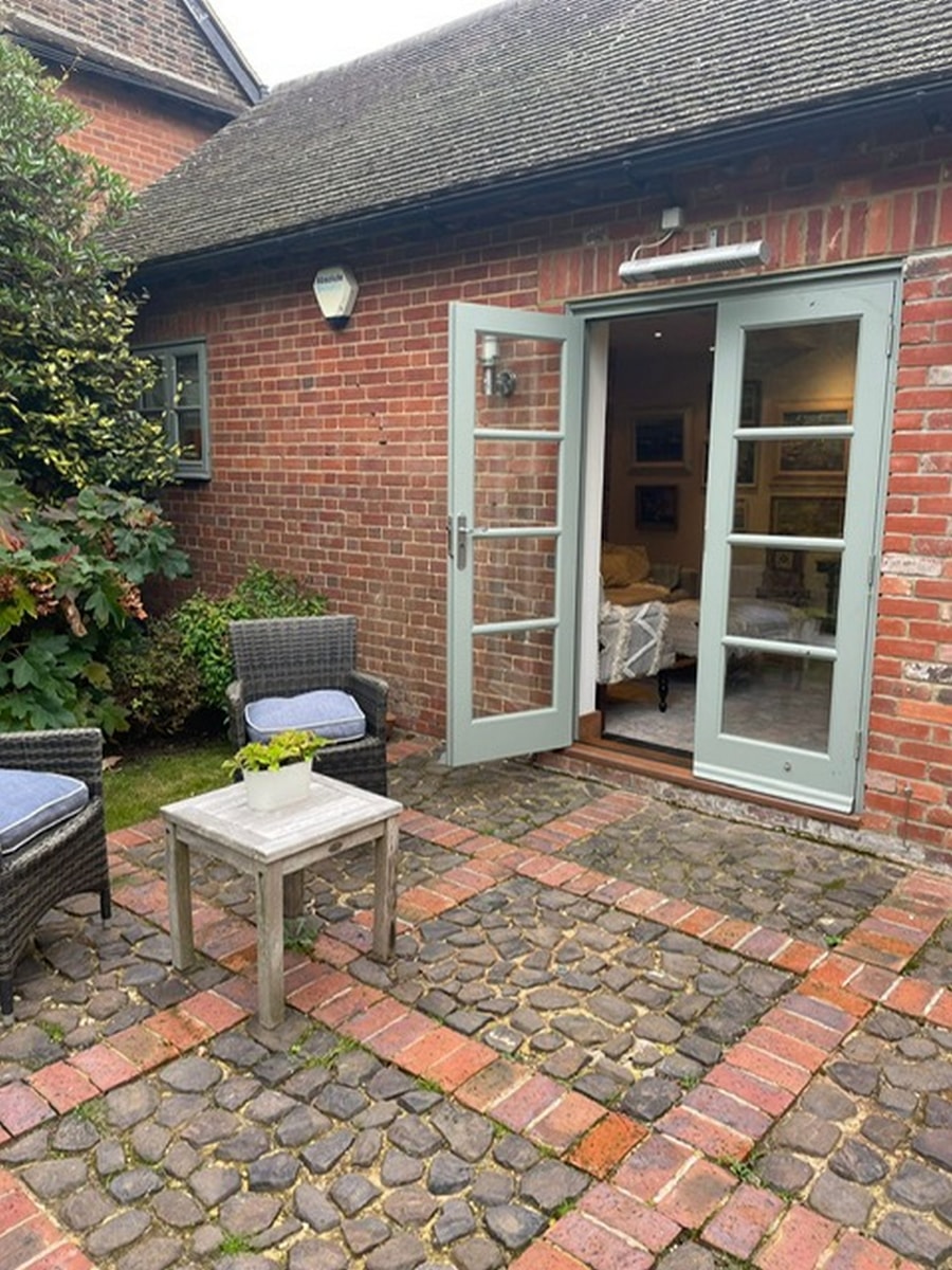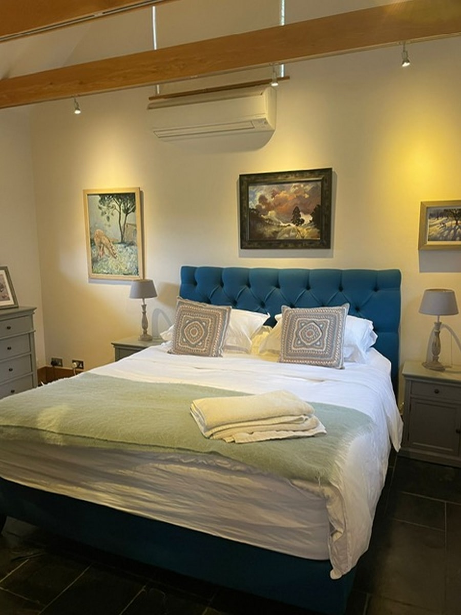 The space is cosy with a 'super king' bed and a very warm and atmospheric sitting room filled with paintings. There is a large smart TV and the cottage stays cool in the summer with air conditioning and cosy with underfloor heating in the winter.